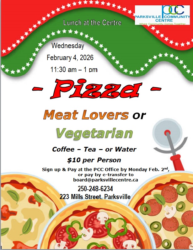 – Attendees must sign up and prepay at the PCC Office on or by Monday, February 2, or pay by E-Transfer to the email address board@parksvillecentre.ca (In the notes field please indicate the date of the lunch you are paying for)