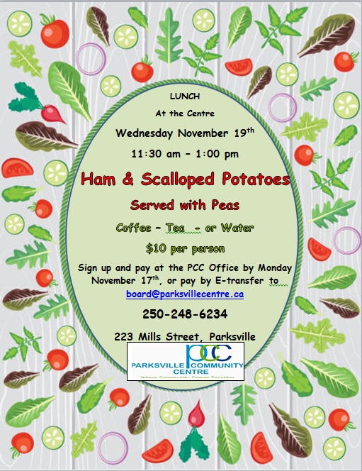 – Attendees must sign up and prepay at the PCC Office on or by Monday, November 17, or pay by E-Transfer to the email address board@parksvillecentre.ca (In the notes field please indicate the date of the lunch you are paying for)