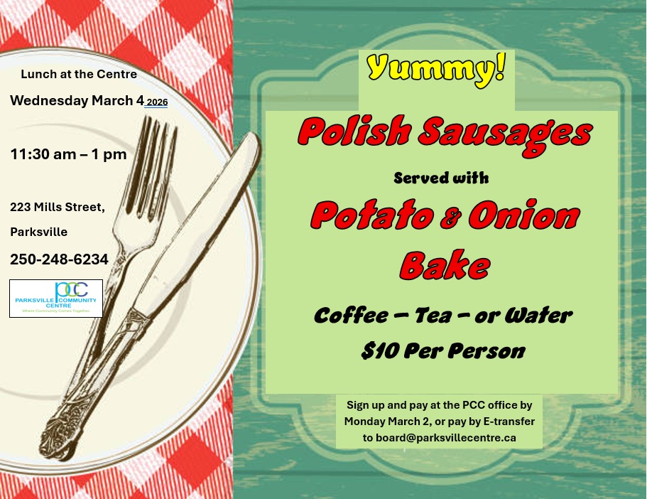 – Attendees must sign up and prepay at the PCC Office on or by Monday, March 2, or pay by E-Transfer to the email address board@parksvillecentre.ca (In the notes field please indicate the date of the lunch you are paying for)