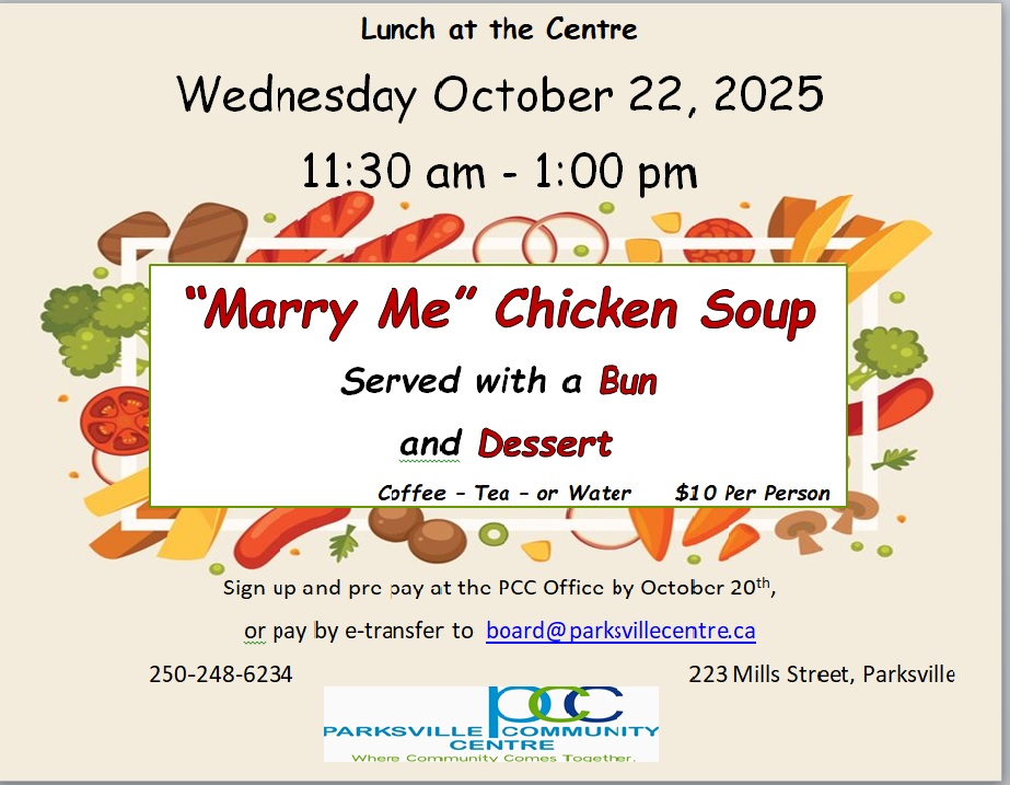 – Attendees must sign up and prepay at the PCC Office by Monday, October 20, or pay by E-Transfer to the email address board@parksvillecentre.ca.