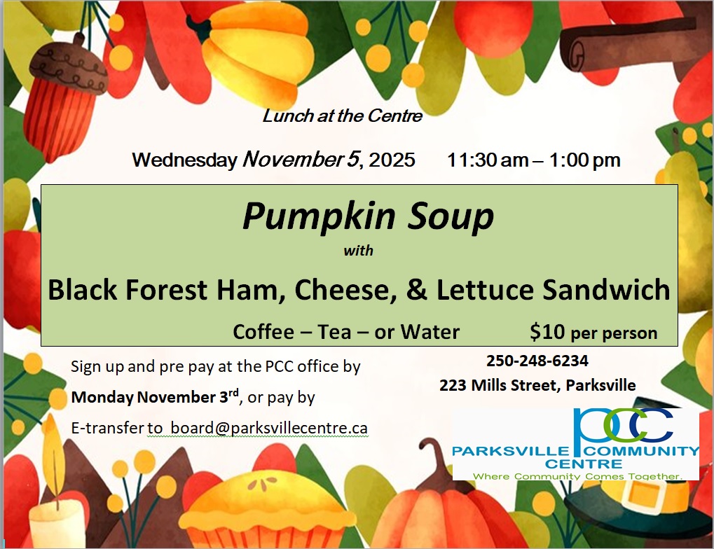 – Attendees must sign up and prepay at the PCC Office on or by Monday, November 3, or pay by E-Transfer to the email address board@parksvillecentre.ca (In the notes field please indicate the date of the lunch you are paying for)