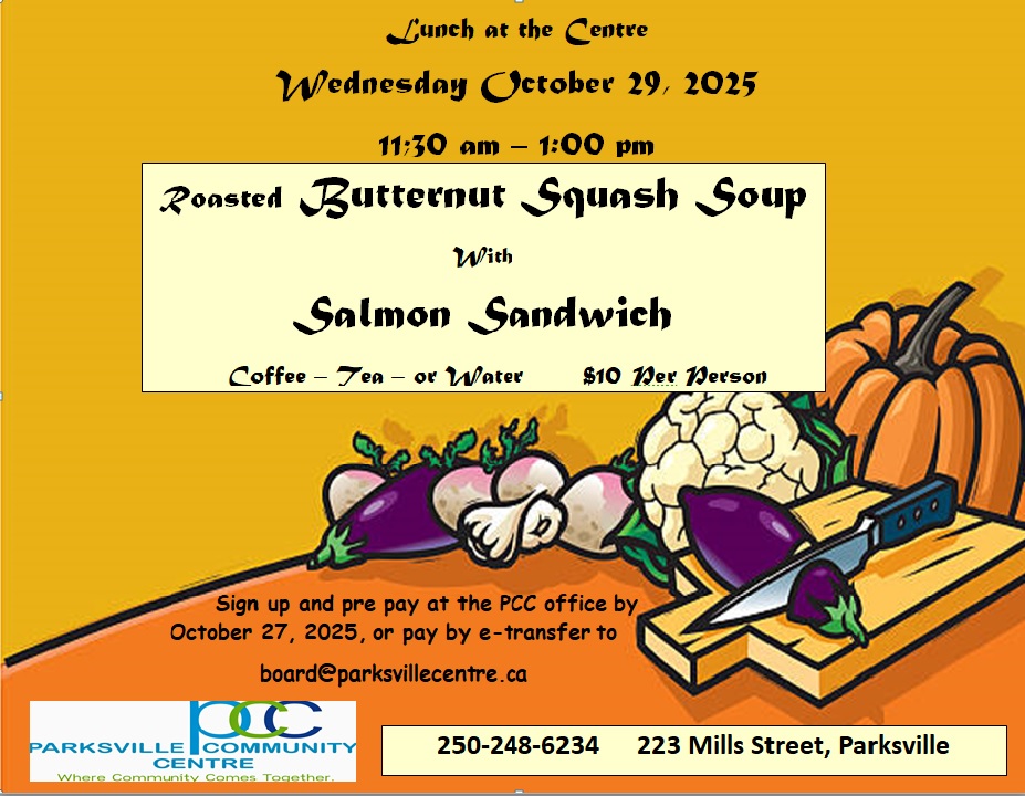 – Attendees must sign up and prepay at the PCC Office on or by Monday, October 27, or pay by E-Transfer to the email address board@parksvillecentre.ca